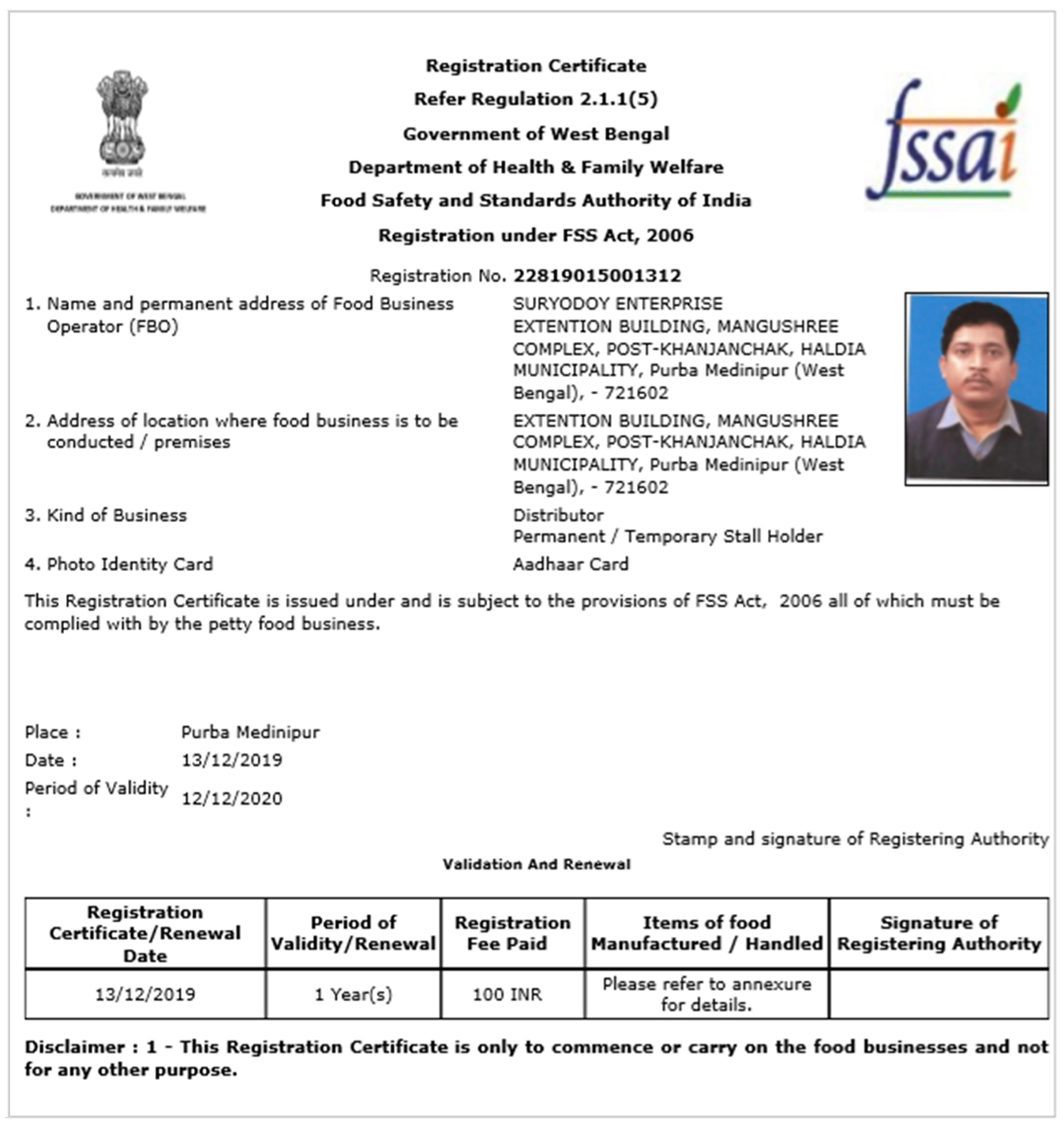 FSSAI CERTIFICATE SAMPLE
